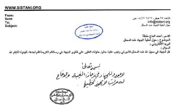 Irak'ın işgal sürecinde tarihe damga vuran en önemli olaylardan biri de ülkenin en büyük Şii otoritesi olan Ayetullah Sistani'nin 200 milyon dolar karşılığında ABD'ye karşı direnişi haram sayan fetva vermesidir. Sistani fetva karşılığı elde edilen paranın fakirlere dağıtıldığını resmi sitesinde kabul etmiştir. İlgili fetvanın Arapça metni aşağıdadır.