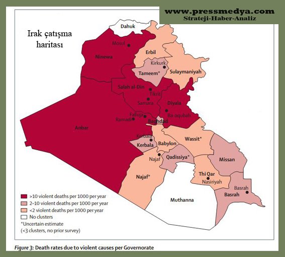 Irak'ta çatışma alanlarını gösteren haritada da görüldüğü gibi işgal güçlerine sadece Sünni bölgeler direnmiştir[10]