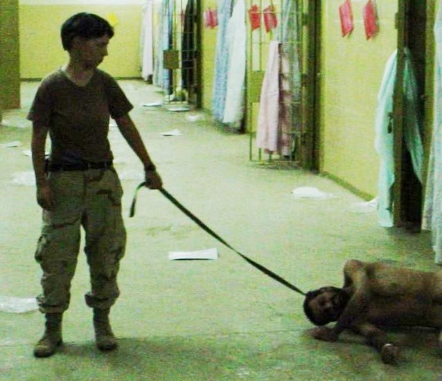 Ebu Garib Cezaevi'ndeki işkencelerin sembolü Iraklı Kürt direnişçi Abdullah'ı boğazından tasmayla bağlayan ABD'li kadın asker. Abdullah işkence sonrası yaşamını yitirmişti