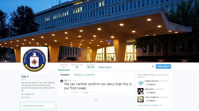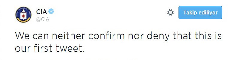 CIA'in ilk tweeti, teşkilatın genellikle bir olayla ilgili bilgi vermekten kaçındığı zamanlarda kullandığı klasikleşmiş üslupta oldu: Bunun ilk tweetimiz olduğunu ne teyit edebiliriz, ne de inkar.