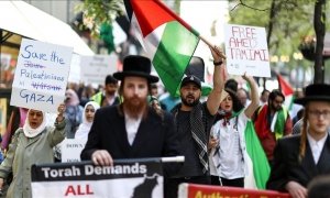 İsrail Başkonsolosluğu önünde toplanıp sloganlar eşliğinde yürüyen grup, Gazze Şeridi'nde İsrail'in Filistinlilere, gazeteciler ve sağlık çalışanlarına yönelik saldırılarını protesto etti.