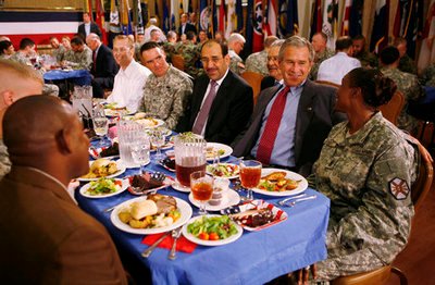Şii lider Irak Başbakanı Nuri Maliki ve ABD Başkanı George Bush, Irak işgalinden sonra birlikte Amerikan askerilerine verilen moral yemeğinde.