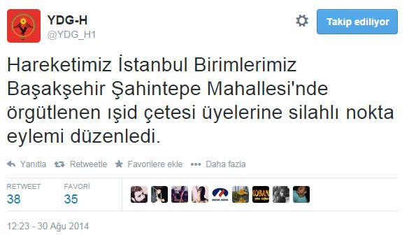 30 Ağustos 2014 akşamı PKK’nın gençlik kolu (YDG-H) Twitter hesabından İstanbul’un Başakşehir ilçesine bağlı Şahintepe Mahalllesi’nde IŞİD üyelerine yönelik saldırı gerçekleştirdiklerini ve bir kişiyi öldürdüklerini duyurdu.